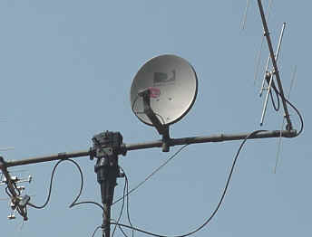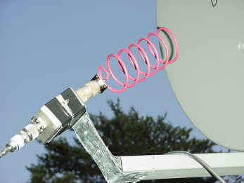 | August 10, 2002 Normally I use a 90cm dish. Today I am testing a 18" DSS dish. The test setup show above. Outside is a 5 1/2 turn helix and a 13ULNA preamp. Inside is the power inserter for the 13ULNA and the TranSystem 3733 converter and the 3733 power inserter. More tests to follow. See the same setup with a 2 1/2 turn helix here. |
